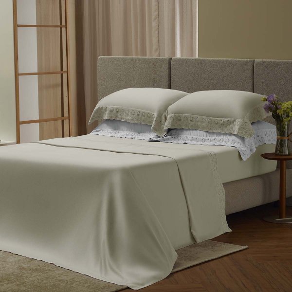 Este jogo de cama exclusivo combina elegância e durabilidade com sua delicada renda em bordado inglês aplicada no lençol superior e nas fronhas. O tecido 100% algodão garante respirabilidade e conforto térmico durante todas as estações do ano.