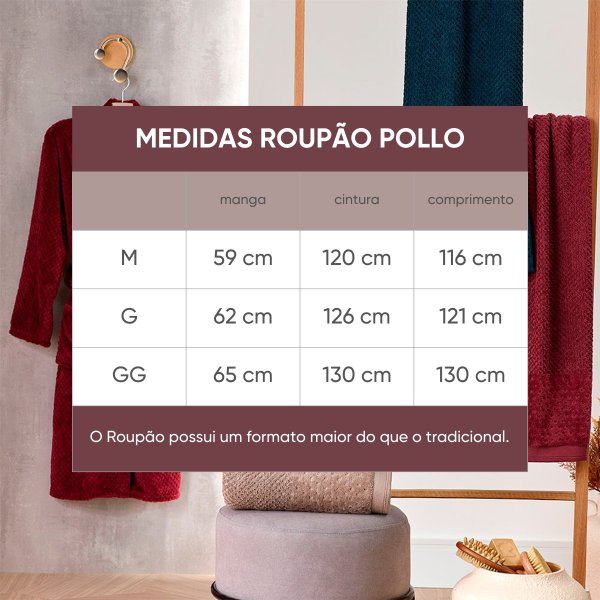 Seu design em corte kimono une funcionalidade e elegância, com cores clássicas e sofisticadas que coordenam perfeitamente com as toalhas da linha Pollo. Disponível nos tamanhos M, G e GG, garante um ajuste confortável e uma sensação de bem-estar em todos os momentos.